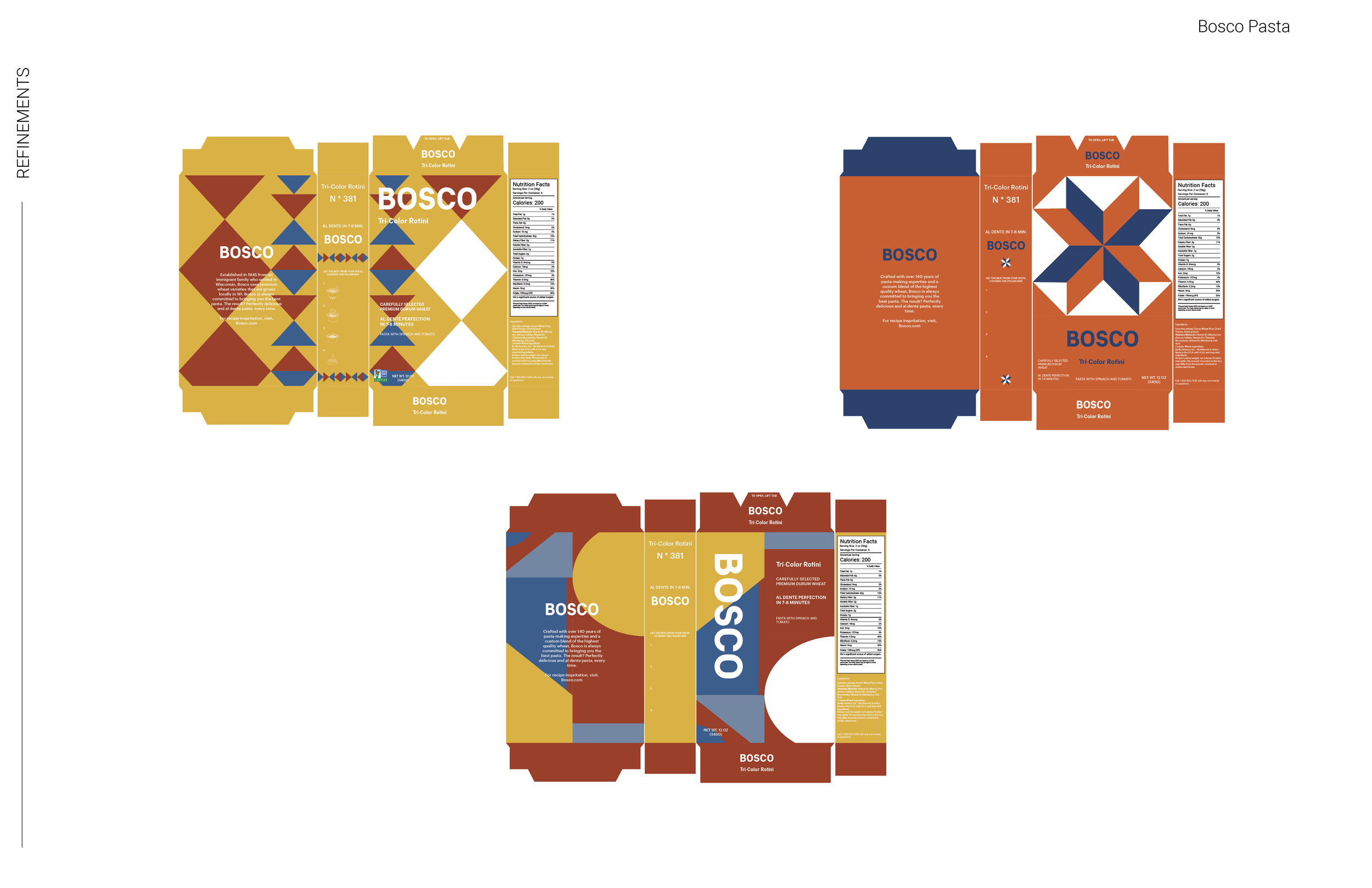 This project focuses on Bosco Pasta, a Wisconsin-inspired brand that celebrates the warmth of homemade cooking and family tradition. The packaging blends modern design with nostalgic detail, featuring a die-cut window inspired by barn quilts to reveal the pasta inside. Earthy colors, refined typography, and subtle heritage cues balance authenticity with a fresh, contemporary feel. The design highlights both craftsmanship and comfort, bringing a modern touch to a timeless kitchen staple.