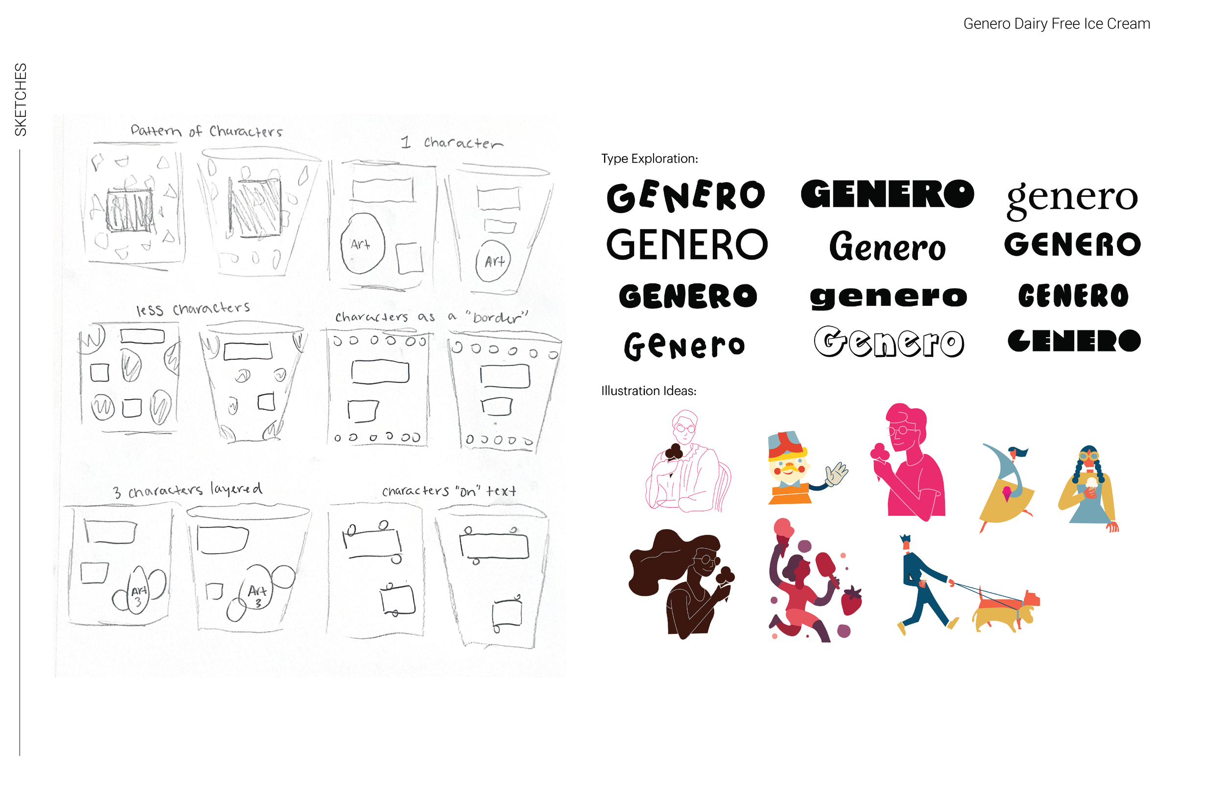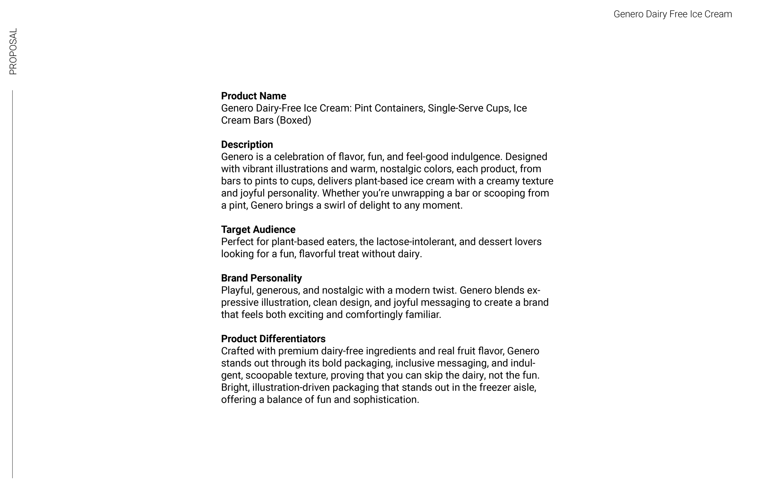 This project centers on Genero, a dairy-free ice cream brand built around the idea of generosity and joy. The packaging series includes a single-serve cup, pint, and ice cream bar box, each designed to work at its own scale while sharing a cohesive visual identity. Playful illustrations, warm colors, and clean typography create a nostalgic yet modern look that celebrates plant-based indulgence.