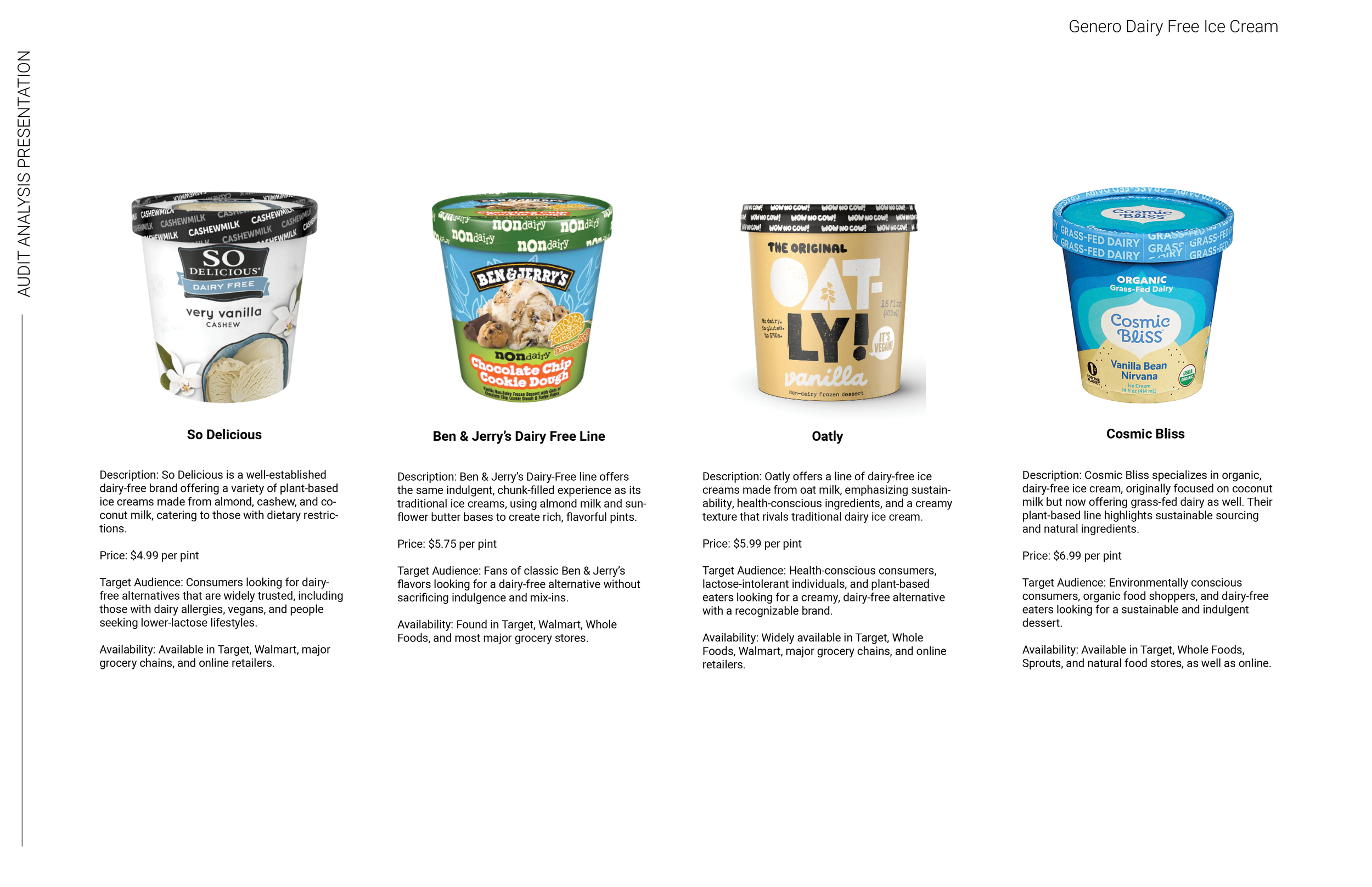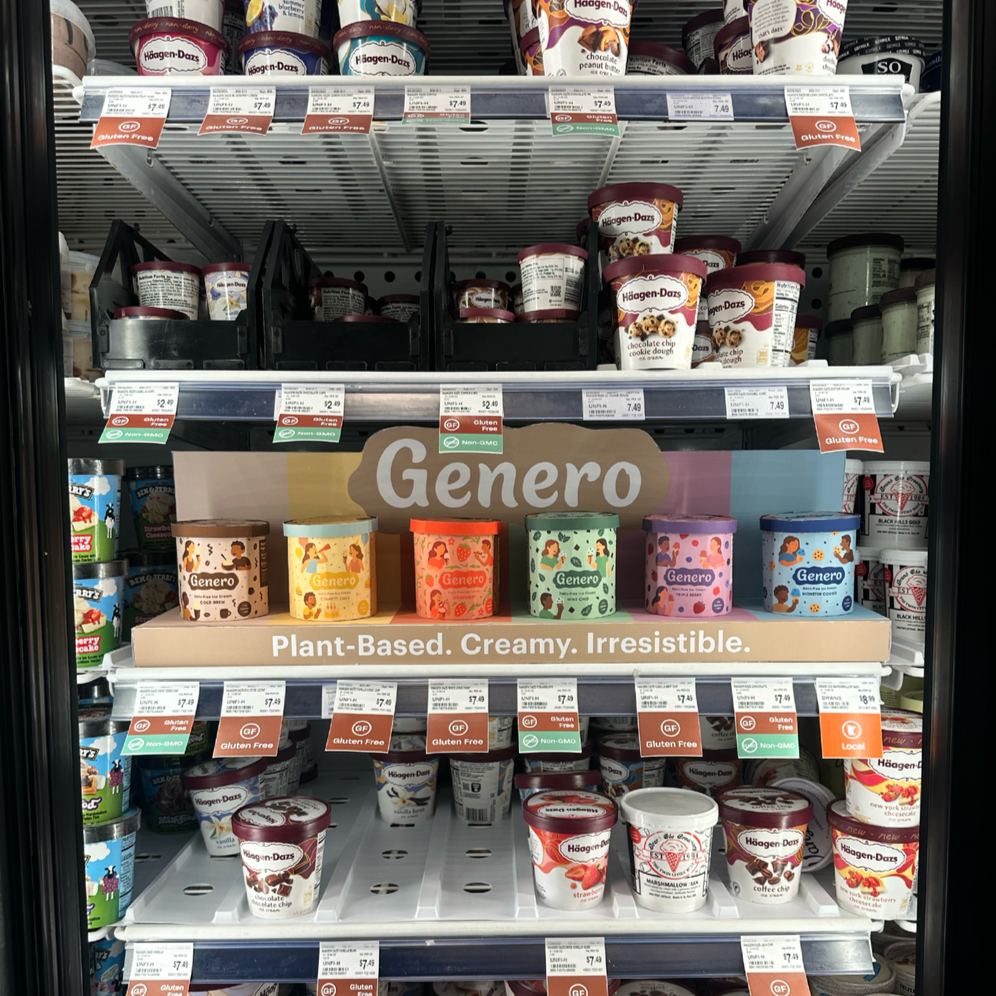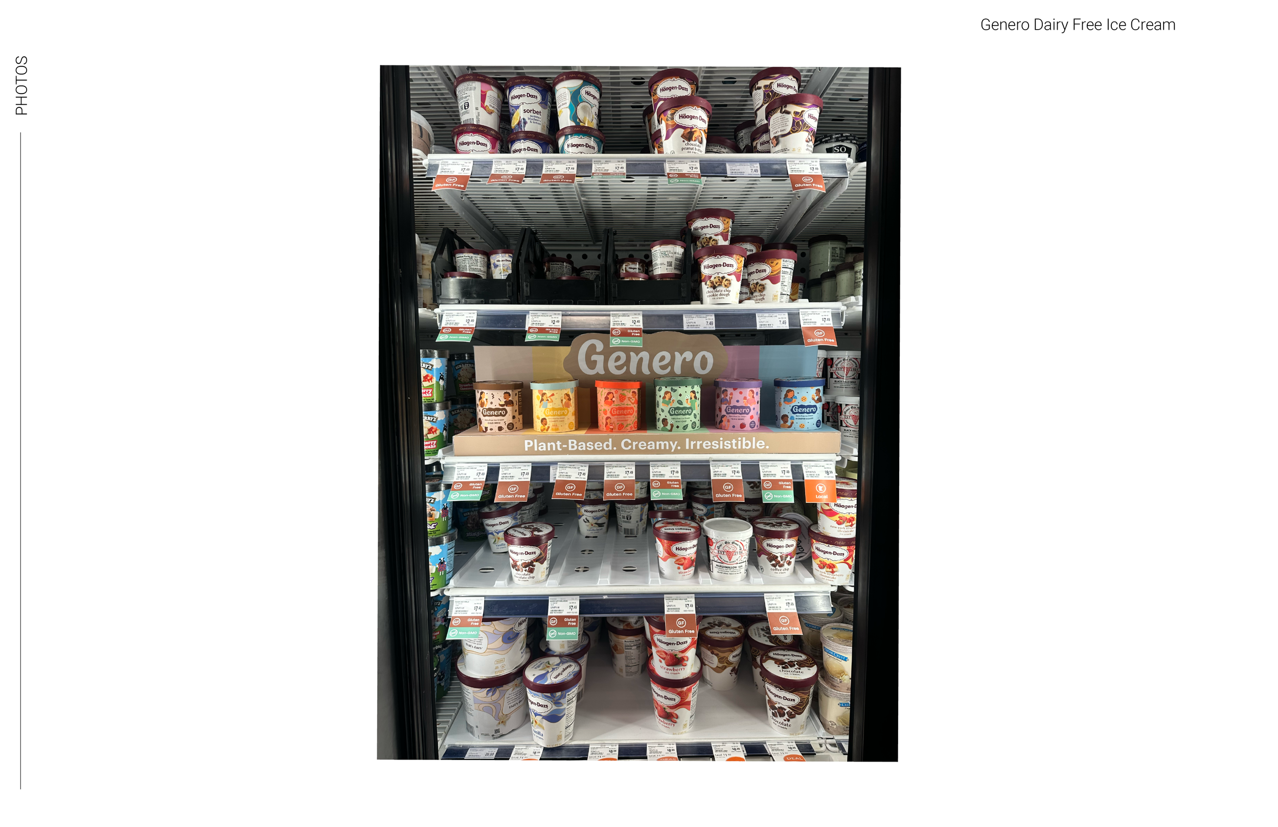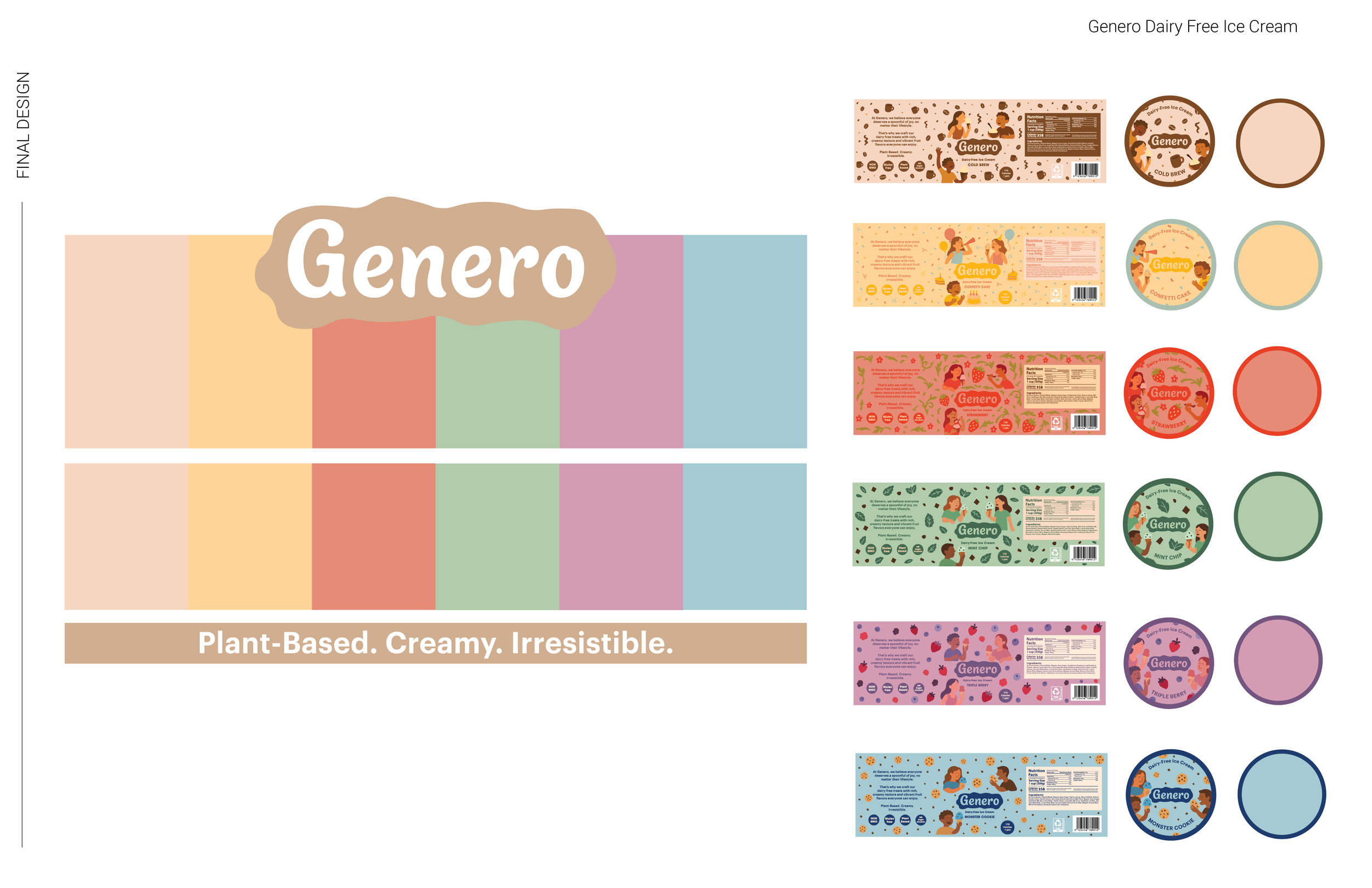 As an extension, a freezer-friendly POP display was designed to showcase the expanded pint lineup in retail spaces. Each flavor has its own bold color zone, with the scalloped Genero logo and tagline “Plant-Based. Creamy. Irresistible.” bringing the brand together. The design balances vibrant energy with simple structure to make flavor discovery easy and inviting.